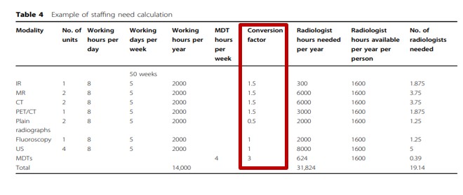 Zoals te zien valt, gaat men ervan uit dat voor 1 uur CT/MR/IR tijd 1,5 uur radioloog nodig is. Het MDO dat 1 uur duurt, vraagt 3 uur 'radiologentijd', inclusief 2 uur voorbereidingstijd. Het EU-REST rapport levert ook een excelbestand aan als supplement waarmee kan worden gerekend met het eigen aantal modaliteiten.